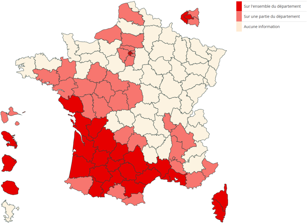 Pour savoir si votre commune est touchée, n’hésitez pas à consulter les cartes de l’Observatoire ici : la carte départementale des infestations et la carte départementale des arrêtés préfectoraux